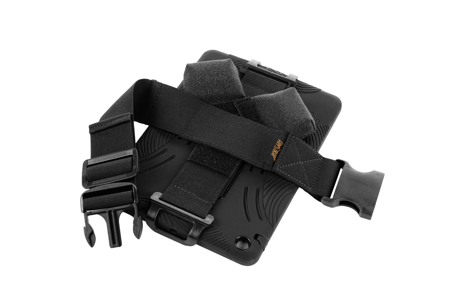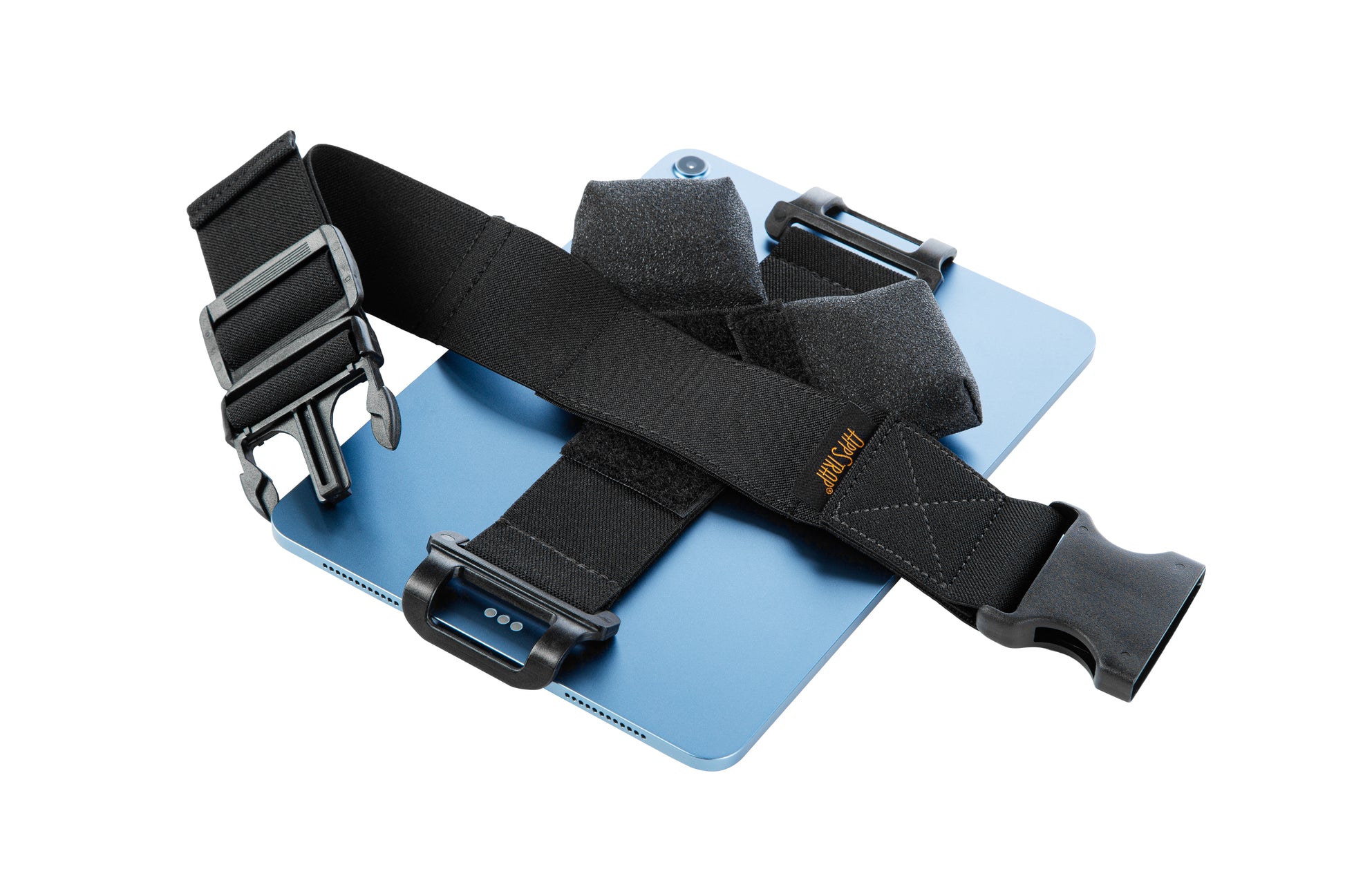 The AppStrap 5 fits heavy-duty and military cases like the OtterBox, Survivor, and Gumdrop, or cases .7 inches (or less) thick. The AS-5 uses two form-fitting black polycarbonate clips and comes with an adjustable leg strap with pen holder, and 2 Tilt Pads for angled-up viewing, device cooling, and enhanced stability. The AS-5 has a clip strap that is designed to fit securely across cases/devices that are approximately 8-10 inches, such as the iPad and iPad Air.